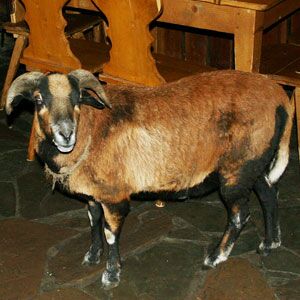Bock und Nachfahre eines alten Bergschaf-Geschlechtes/ springfreudig und zutraulich/ ein lehrreicher Spruch anbei: "Drehe nie einem Bock den Rücken zu,sonst setzt es einen Hieb im nu!"
